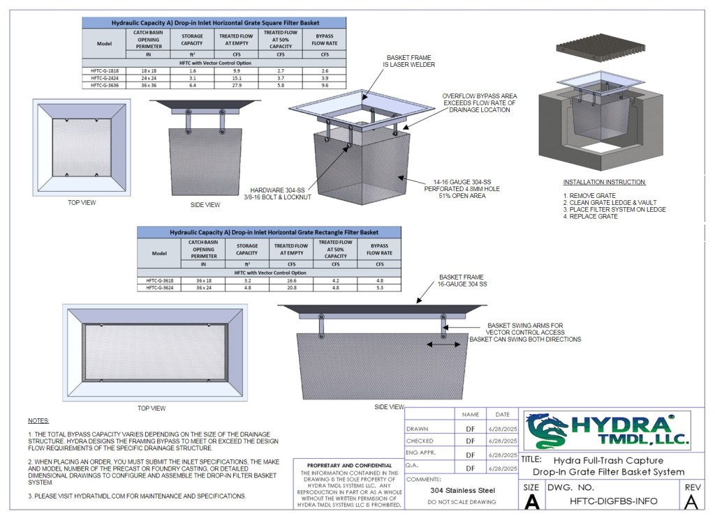 The HYDRA® HFTC Drop-in Filter Basket Insert is a high-performance, stainless steel filtration system engineered to intercept trash and debris at the storm drain inlet, preventing the discharge of pollutants into downstream waterways. Fabricated from 304 stainless steel and featuring 4.8 mm perforations, the insert is fully compliant with California full trash capture regulations, effectively capturing leaves, floatables, and solid waste while maintaining unobstructed stormwater flow for optimal drainage performance.